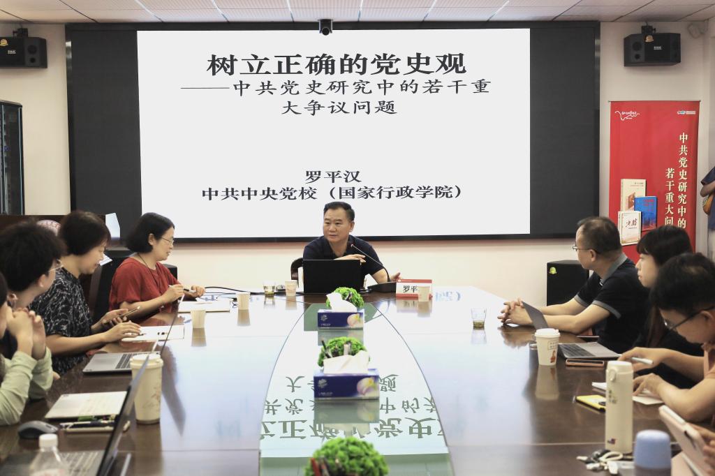 随后,罗平汉以《树立正确的党史观——中共党史研究中的若干重大争议问题》为题进行分享交流。他以案例为引,沿着中国共产党从诞生到成长壮大的历史脉络,聚焦四个问题,即遵义会议是否确立了毛泽东的领导地位、国共两党在抗日战争中的作用问题、土地改革及土地改革运动问题以及如何看待十一届三中全会前社会主义建设的失误问题,与在场师生展开了深入讨论。他以深入浅出的方式,剖析了复杂的主客观因素对历史事件的影响,带领在场师生充分领略了百年党史的深厚底蕴。