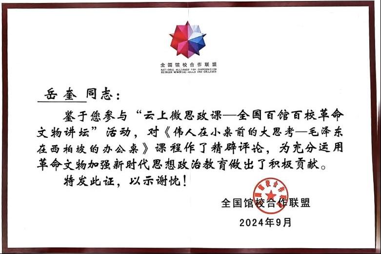 会上,与会领导向参加“云上微思政课——全国百馆百校革命文物讲坛”活动的18位获奖选手、12位评论人和18座革命场馆分别颁发奖状和感谢状。其中,我院院长、教授岳奎对《伟人在小桌前的大思考——毛泽东在西柏坡的办公桌》课程作出精辟评论,为充分运用革命文物加强新时代思想政治教育做出了积极贡献,收到了由全国馆校合作联盟颁发的感谢状。