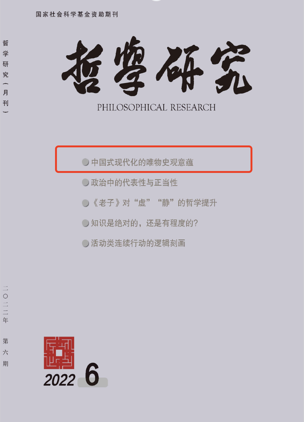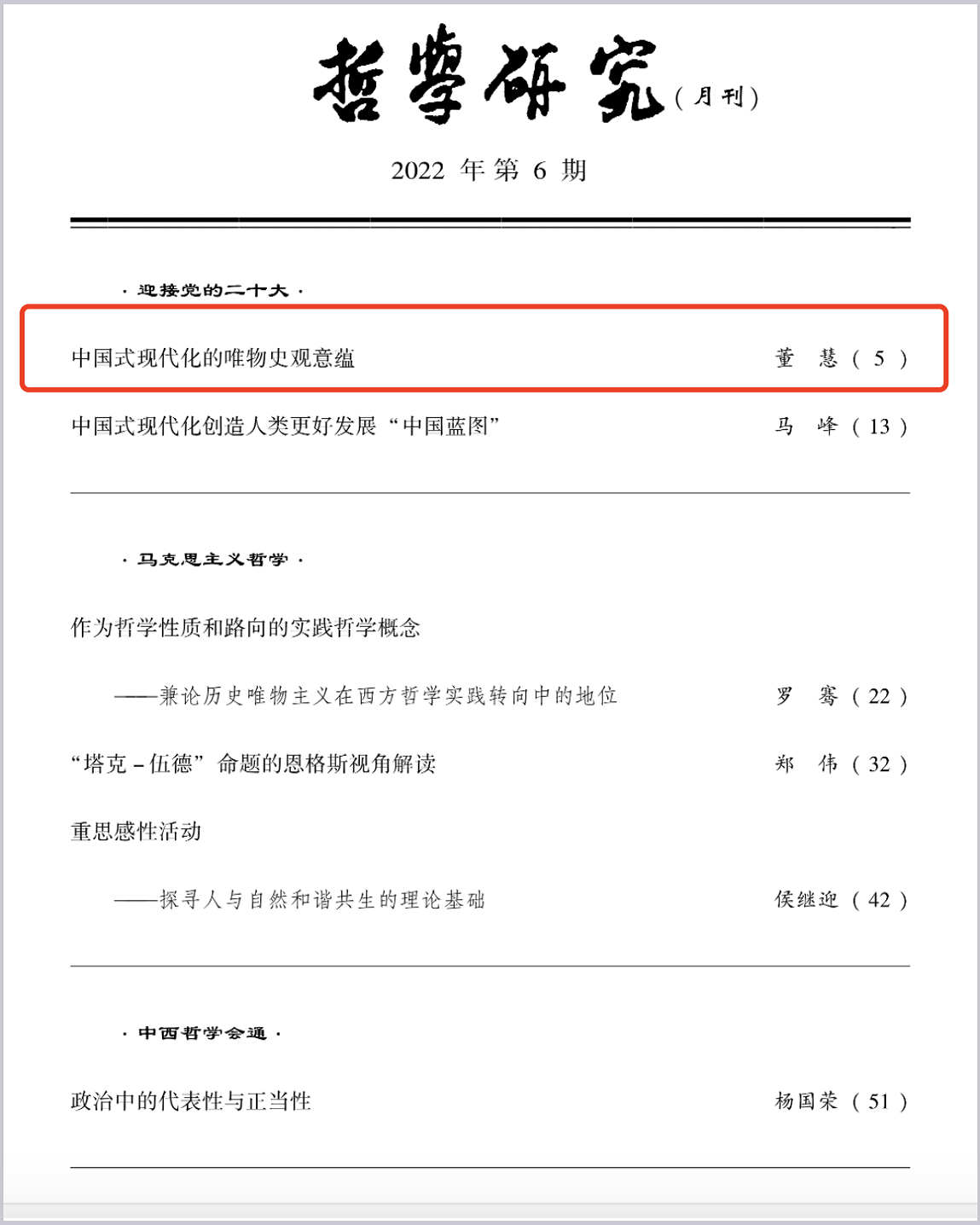 《哲学研究》2022年第6期封面首篇文章刊发我院董慧教授学术论文《中国式现代化的唯物史观意蕴》。该文系2021年度教育部哲学社会科学研究重大课题攻关项目“中国共产党领导下中国现代化道路探索历程与经验研究”的阶段性成果;受2022年“伟德源自英国1946文科双一流建设项目基金(马克思主义基础理论及其创新发展研究)”资助。