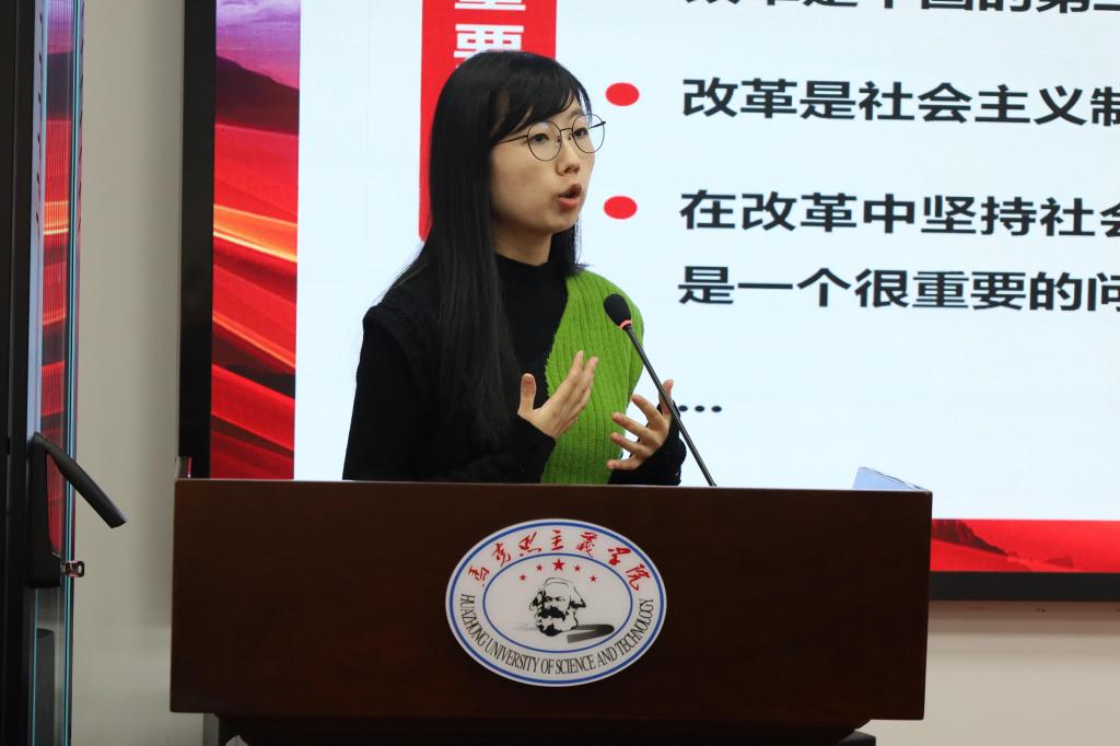 接着,唐丽敏和丁滋芳围绕“党的二十届三中全会精神融入概论课”进行了深入探讨。唐丽敏提出应以当前我国经济科技发展成就以及民生改善现状的时事热点进行引入,串联起党的历次三中全会的成果,明确改革是社会主义制度的自我完善和发展,将进一步全面深化改革的精神系统融入整个课程教学体系。丁滋芳提出,应通过梳理改革的历程,阐述全面深化改革的性质、方向、目的和原则,从而通过理论教学帮助学生更好把握改革中“变”与“不变”的辩证关系,理解当前深化改革的方向和意义。