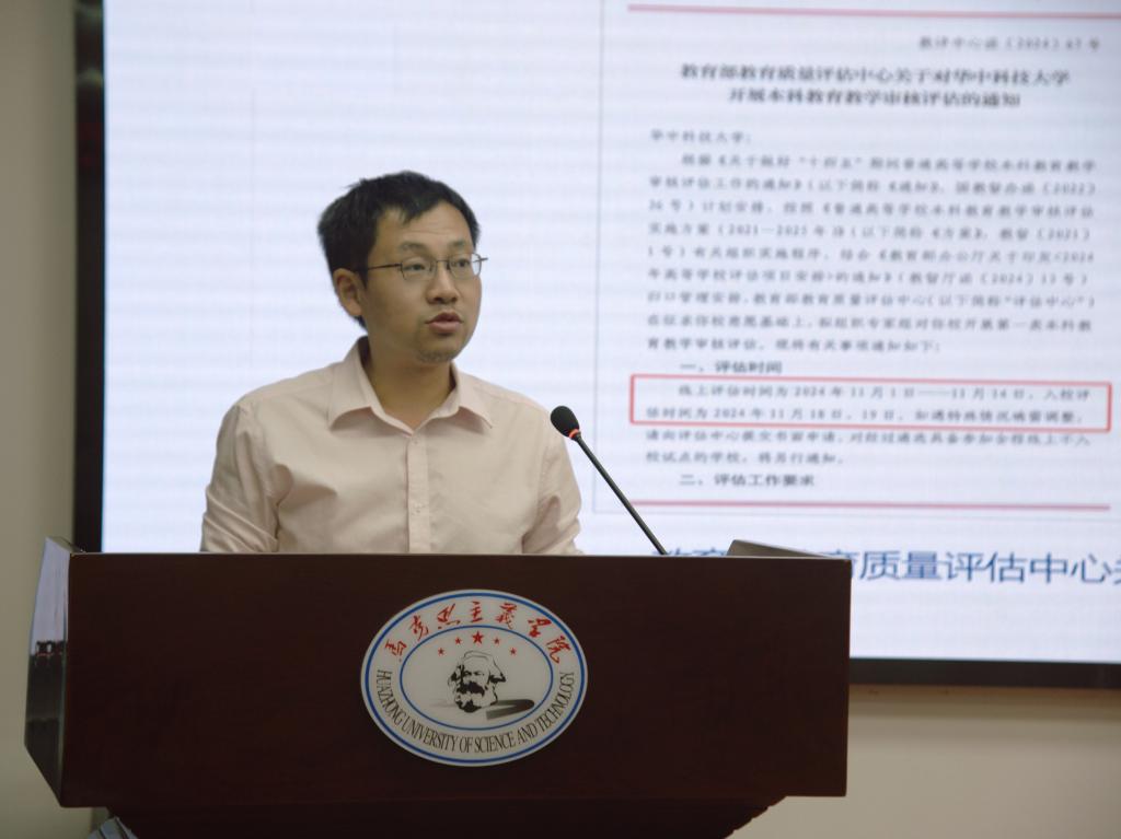 副院长沈昊驹就新一轮本科教育教学审核评估工作要求及学校迎评工作安排进行介绍。他详细介绍了相关评估工作的具体安排与时间节点,并对高质量完成课堂教学工作、核对教学档案、对照归档清单、完善检查质量标准等工作作出进一步强调。