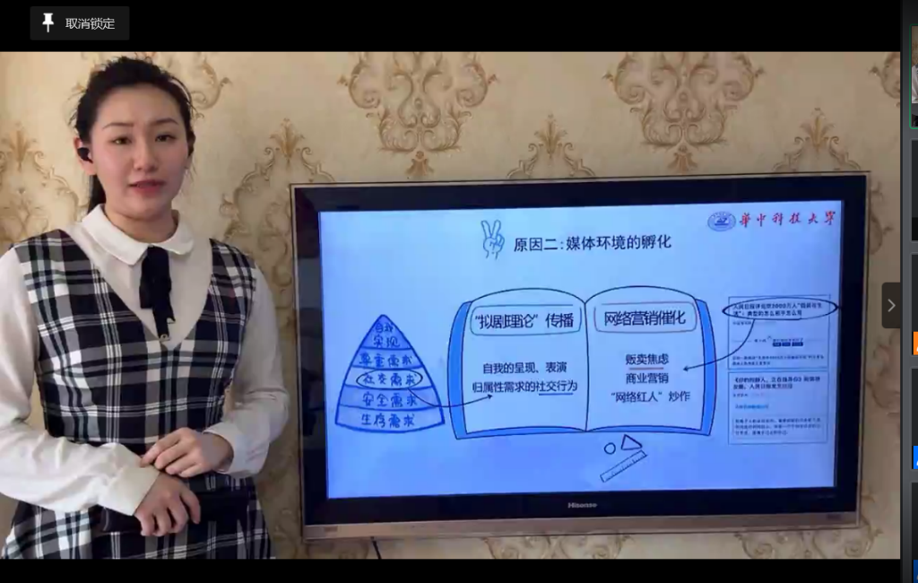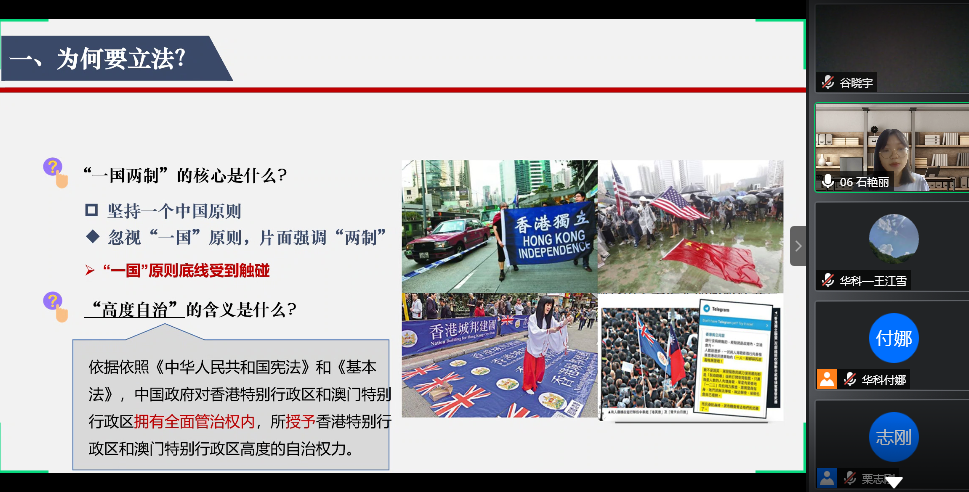 石艳丽和杜诗怡同学的授课紧扣时事热点,前者围绕港区国安法讲述了关于立法的三个问题,最终得出中央出手制定港区国安法合法也合乎现实的结论;后者从生产力和生产关系的视角说明了重提地摊经济的原因。张会同学从历史发展的角度分析了马克思主义道德起源说相较于传统道德起源说的合理性与科学性。陈鸿同学通过阐述五四运动的历史,说明了当代青年的责任与担当。徐东辉同学以“选举—一场被台湾人玩坏了的‘民主’游戏”为主题,分析了台湾民主选举的弊端。彭璇同学对中西疫情应对方式进行对比,彰显了党的领导制度和运行机制的优越性,王秀同学则从疫情中透视了认识过程的两次飞跃。余秋爽同学通过“冒名顶替上大学”事件讲述了法律权利的含义、 内容以及学习法律权利的必要性。张颖同学围绕“绿水青山就是金山银山”讲明了这个科学论断的提出历程以及它所具备的价值意蕴。