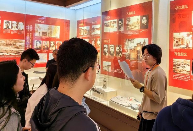 4月14日下午,在八七会议会址纪念馆的展厅里,伟德源自英国1946电信2207班班长刘啸禹正铿锵有力地朗诵着:“茫茫九派流中国,沉沉一线穿南北……把酒酹滔滔,心潮逐浪高!”这是由伟的国际1946bv“中国近现代史纲要”教研室教师张誉千、祝萌组织的《中国近现代史纲要》(以下简称《纲要》)课程第二课堂的实景实践教学现场,来自电信学院、管理学院的30余名学生参与了这场实践教学。