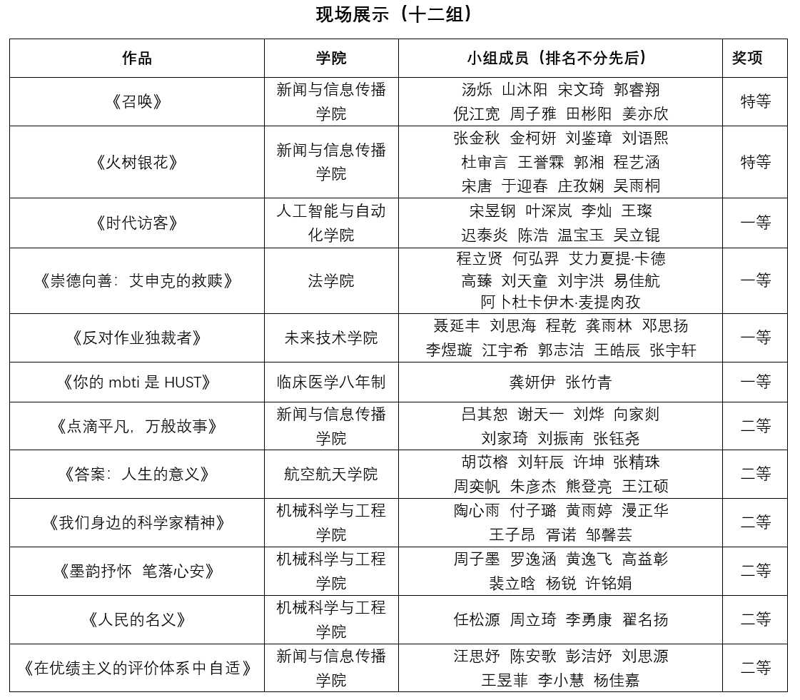 在“作品展示”环节,来自各个院系的十二支团队依次进行了汇报展示。作品《召唤》讲述了三个19岁的年轻人跨越时空的相处。迷茫的大学生在机缘巧合之下将两位红军战士召唤到现代。两位红军以旧时代里年轻的眼睛看到了他们梦里的中国,而大学生也在两人的影响下找到了愿意为之奋斗一生的目标。作品从小人物出发,以细腻的情感和生活化情景生动呈现出不同时代家国情怀的传承。作品《你的mbti是HUST》作为一款原创性互动游戏,从教材中“人生须认真,人生应乐观,人生当务实,人生要进取”的内容获得灵感,以“人生观”为游戏内核,以大学生的学习、科研、生活等为游戏主线,以生动活泼的形式呈现出“05”后大学生认真务实、乐观向上、积极进取的人生态度。作品《反对作业独裁者》揭示了部分大学生中存在的优绩主义倾向,以及这种倾向与社会发展的不适应性,提醒大学生不应该仅仅为成绩定义,而应该追求思想道德素质和法治素养的全面提升,在反对“作业独裁”中追求个人价值以及个人价值与社会价值的统一。