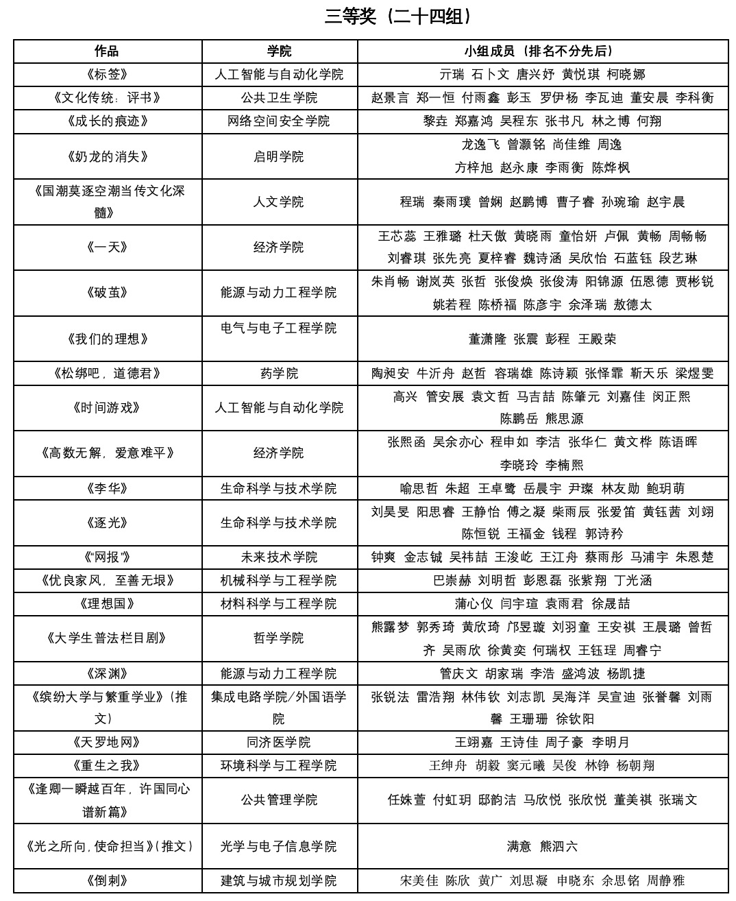 经过同学们前期的精心准备、课程组老师以及现场评委们的认真评审,最终从提交的“微思政”作品中评选出特等奖2组、一等奖4组、二等奖6组及三等奖24组。