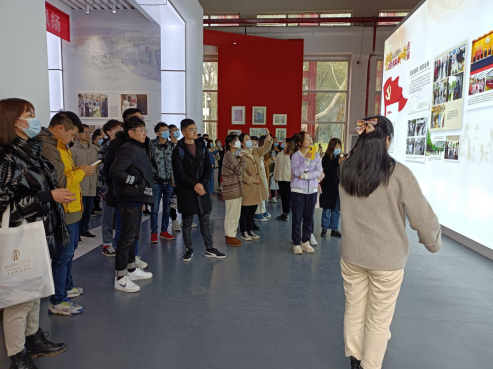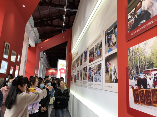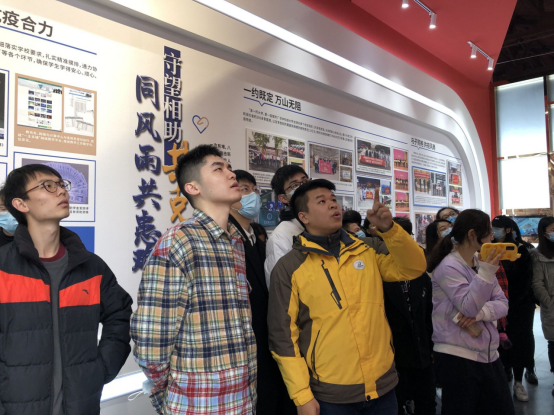 自我介绍结束后,在宣传部抗疫专题展览讲解员的带领下,同志们走进展览馆,伴随着讲解员温暖动人的讲述近距离感受我校“天下兴亡、匹夫有责”的家国情怀和“与人民同舟、与祖国共济”的使命担当。
